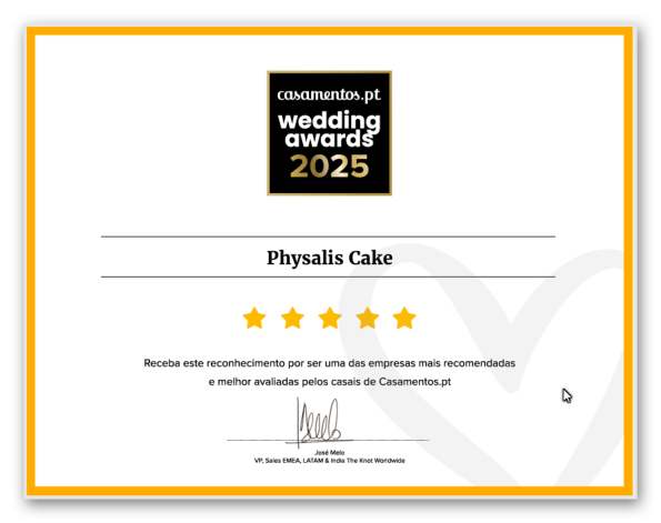 Menções Desde 2014 que a Physalis Cake é reconhecida pelo seu profissionalismoatravés do “Wedding Awards”, pelo sitecasamentos.pt, Site lider noforum dos Casamentos…